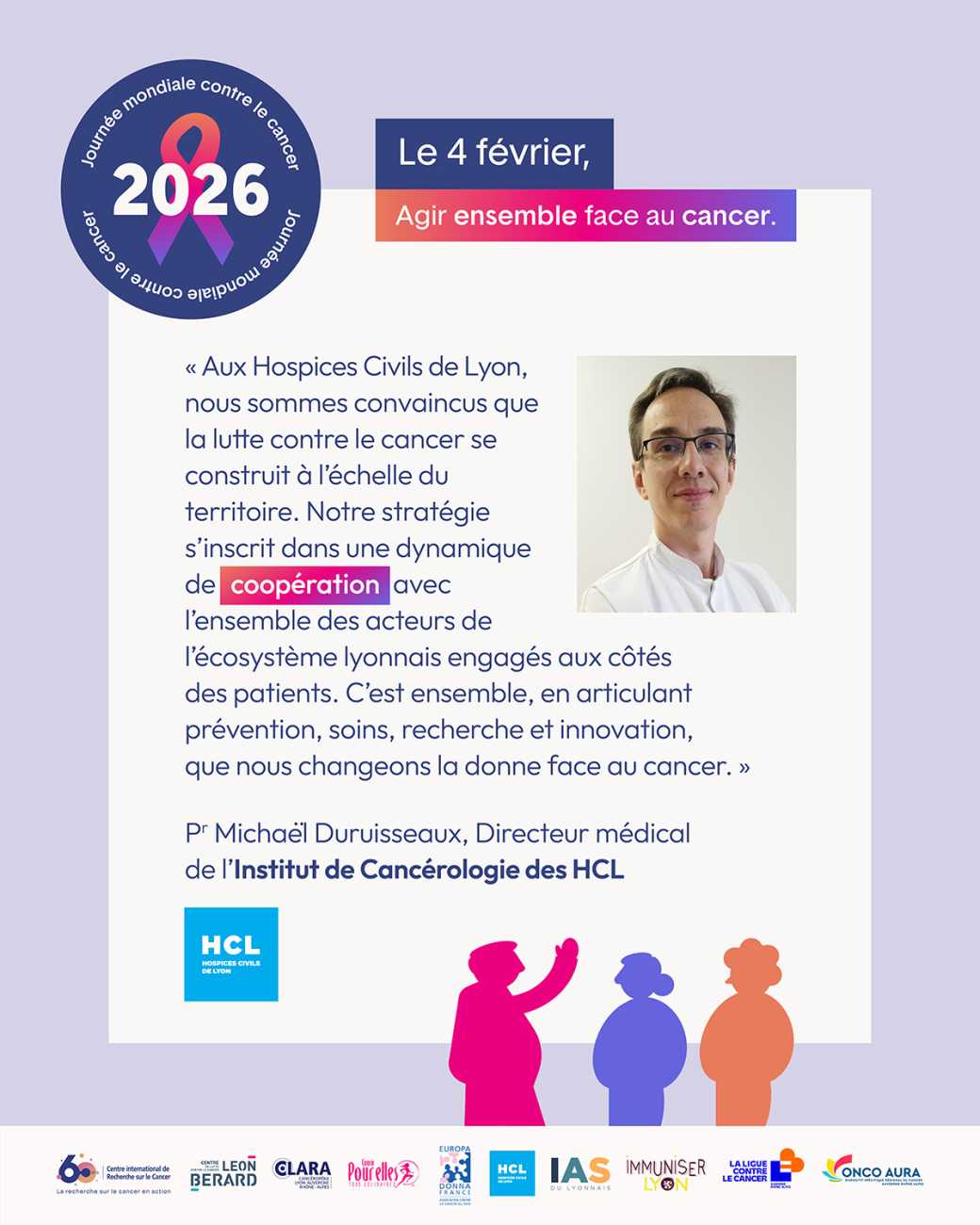 « Aux Hospices Civils de Lyon, nous sommes convaincus que la lutte contre le cancer se construit à l’échelle du territoire. Notre stratégie s’inscrit dans une dynamique de coopération avec l’ensemble des acteurs de l’écosystème lyonnais engagés aux côtés des patients. C’est ensemble, en articulant prévention, soins, recherche et innovation, que nous changeons la donne face au cancer. » souligne le Pr Michaël Duruisseaux, Directeur médical de l’Institut de Cancérologie des HCL