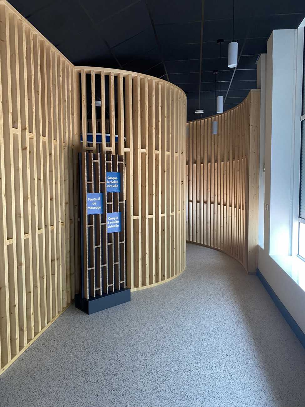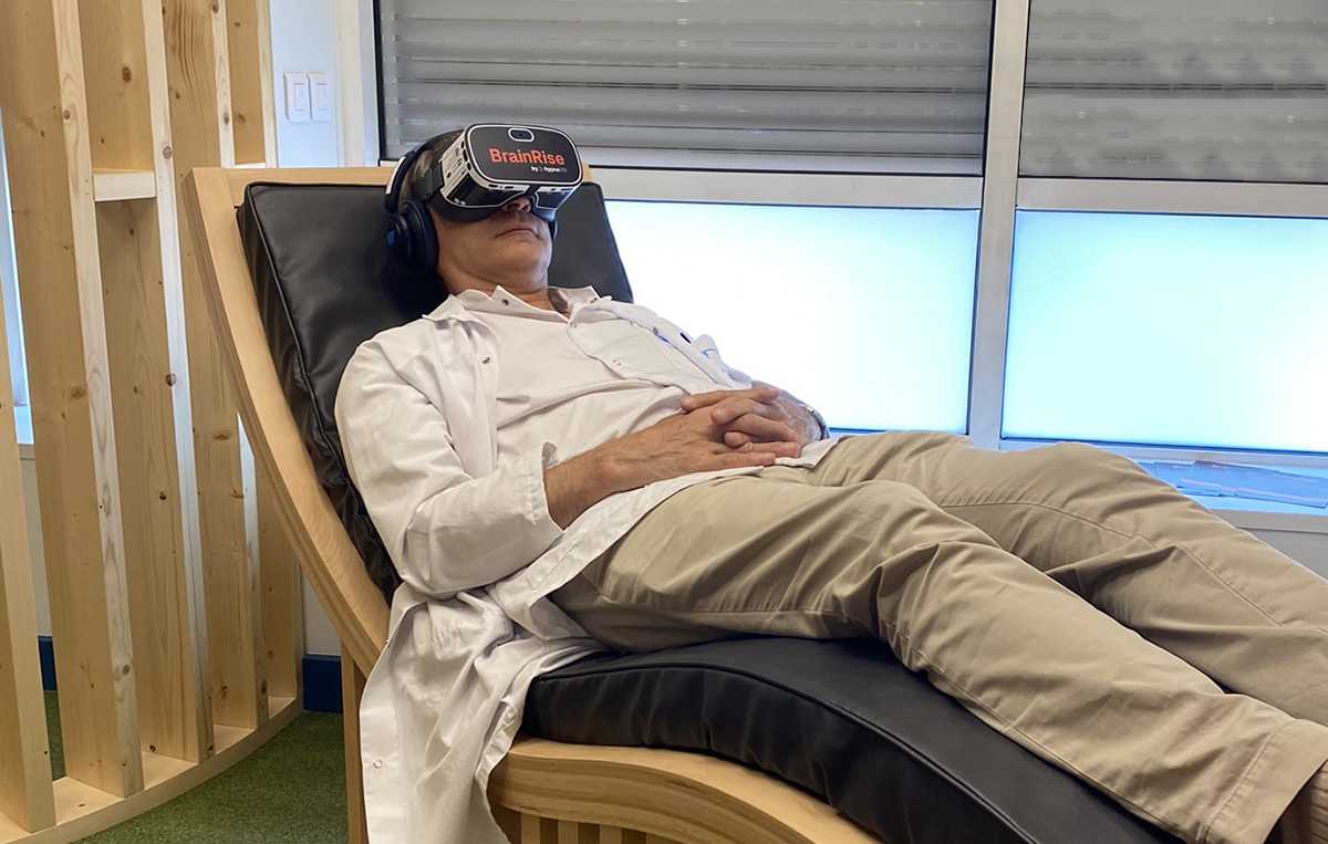 - 2 espaces proposant une expérience immersive de relaxation en réalité virtuelle pour lutter contre le stress et l’anxiété. Grâce à ce dispositif, chaque professionnel peut s’immerger dans 9 univers, 6 ambiances musicales et 5 univers psychologiques tout en sélectionnant la langue de son choix.