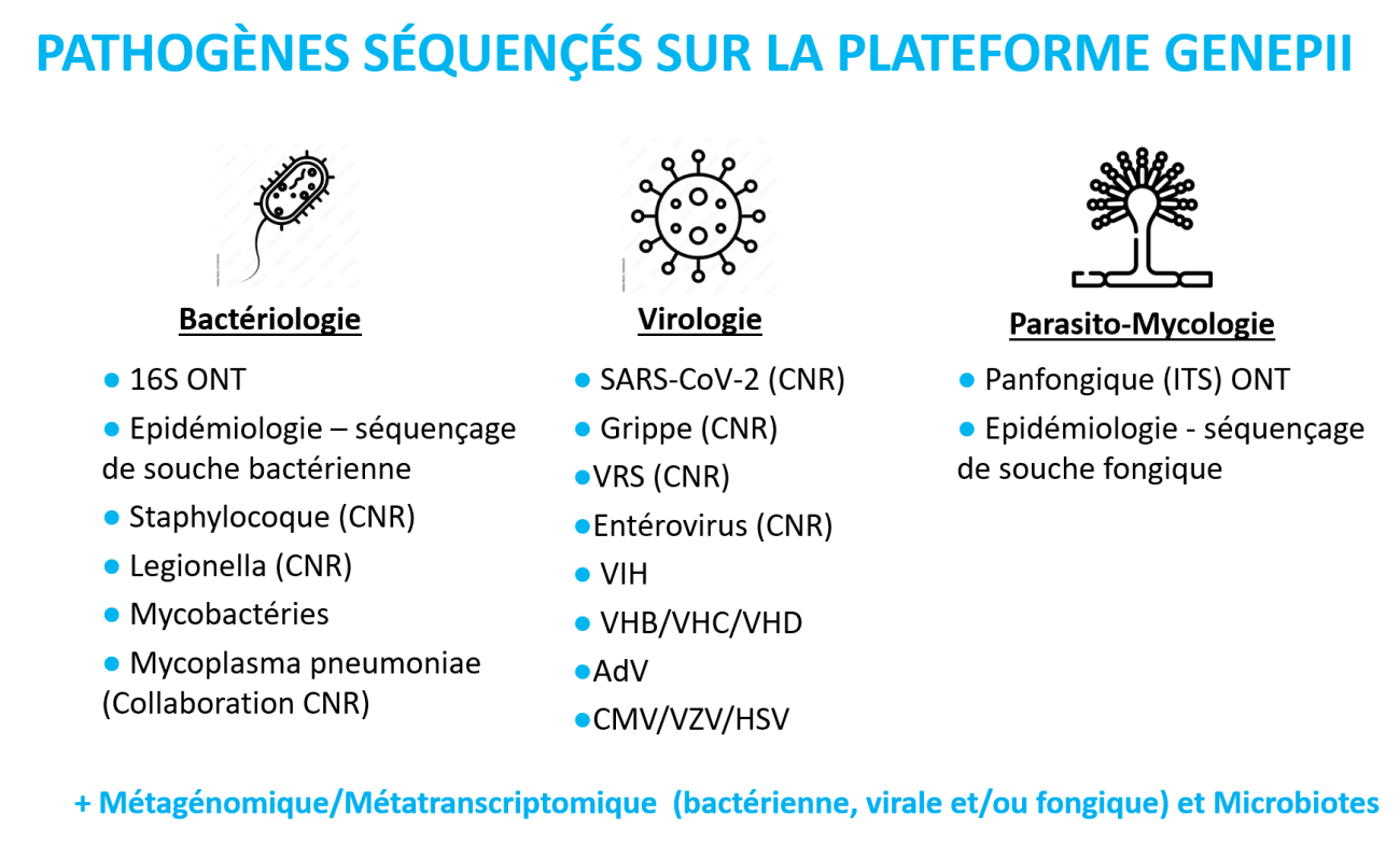 - Diagnostic de recours et identification de pathogènes émergents (techniques sans a priori recherchant l’ensemble des pathogènes (viraux, bactériens, fongiques et parasitaires) ; GenEPII est devenu LBMR (Laboratoire de biologie médicale de référence) pour cette activité