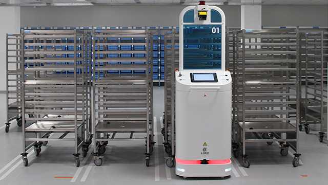 1. La production de l’ensemble des chariots opératoires (géodes), contenant tous les matériels, médicaments et dispositifs médicaux destinés aux blocs, se fait à partir d’un espace de 600m² conçu sur-mesure par l’entreprise Scallog. Plus de 2500 références y sont stockées dans 134 étagères mobiles, elles-mêmes manipulées par 16 robots autonomes. Dans un ballet futuriste, digne du film Wall-E, ces robots apportent directement les étagères à l’opérateur chargé de constituer les géodes, garantissant rapidité, précision et diminution des risques de troubles musculosquelettiques pour les personnels. Ce fonctionnement permet également d’assurer une préparation anticipée, jusqu’à une demi-journée à l’avance, limitant les ruptures et améliorant la disponibilité du matériel.