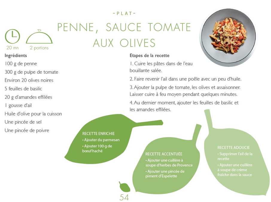 De l’entrée au dessert, en passant par les plats et les collations, 34 recettes variées sont proposées dans le guide, chacune dans quatre versions : recette de référence (pour toute la famille), recette accentuée (en cas de difficulté à percevoir les arômes et saveurs), recette adoucie (en cas d’hypersensibilité gustative ou olfactive) ou recette enrichie (pour les patients concernés par des problèmes de dénutrition).