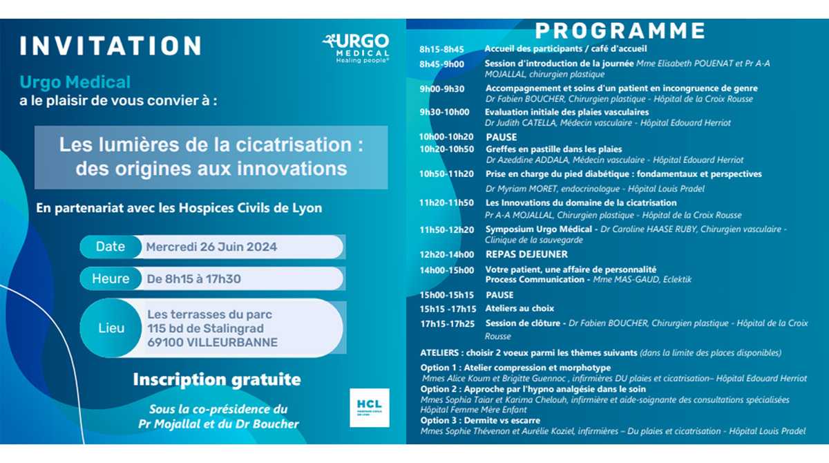 Les HCL et Urgo Medical, organisent une journée de conférences ouverte aux professionnels de santé dédiée à la cicatrisation le mercredi 26 juin 2024 de 8h15 à 17h30.