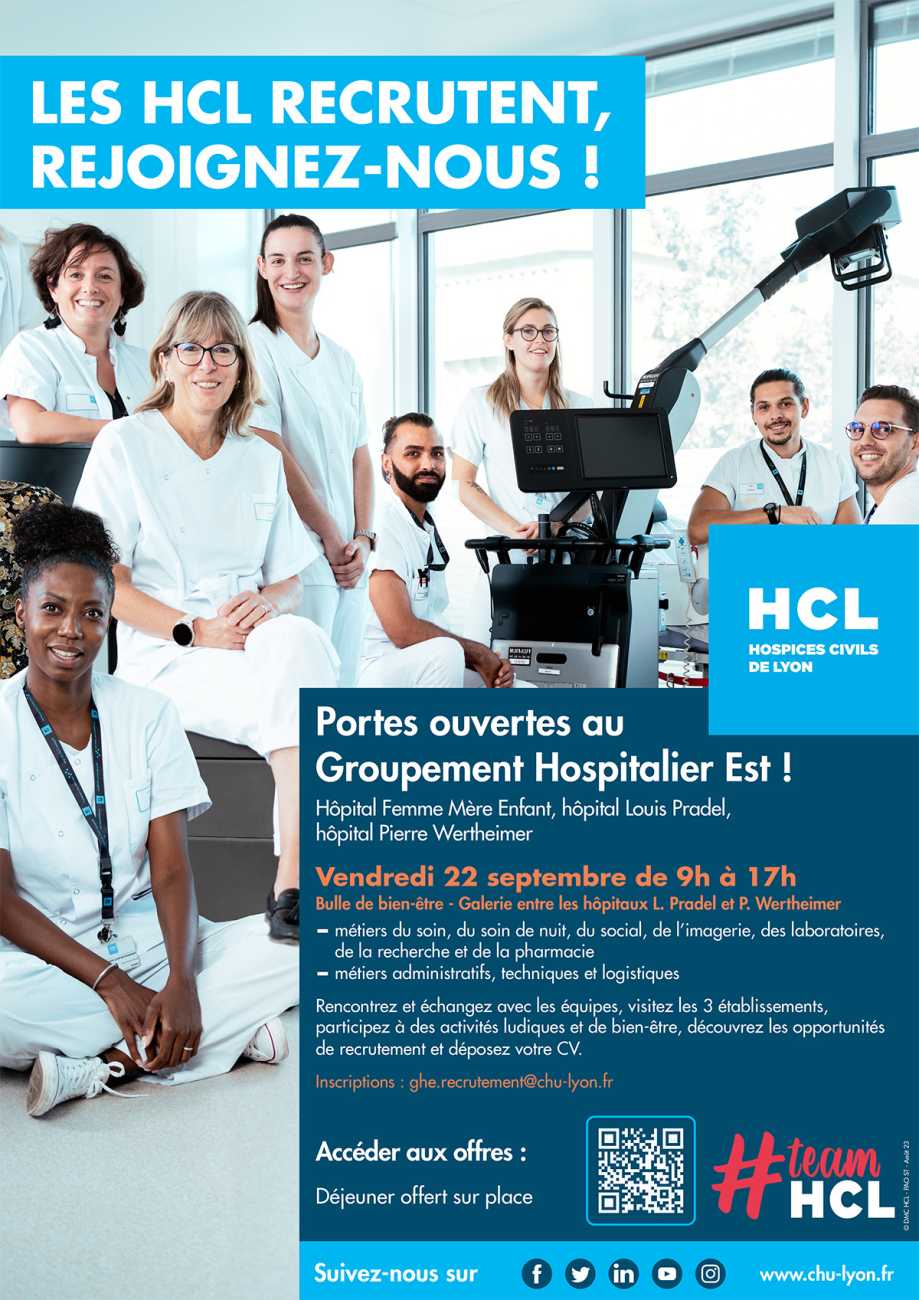 Rencontrez et échangez avec les équipes, visitez les 3 établissements (hôpital Femme Mère Enfant, hôpital Louis Pradel, hôpital Pierre Wertheimer), participez à des activités ludiques et de bien-être, découvrez les opportunités de recrutement et déposez votre CV.