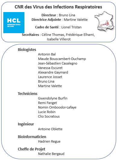 - Pr Bruno LINA, Virologue (MD, PhD), Professeur des universités (PU-PH). Directeur du CNR depuis 2001