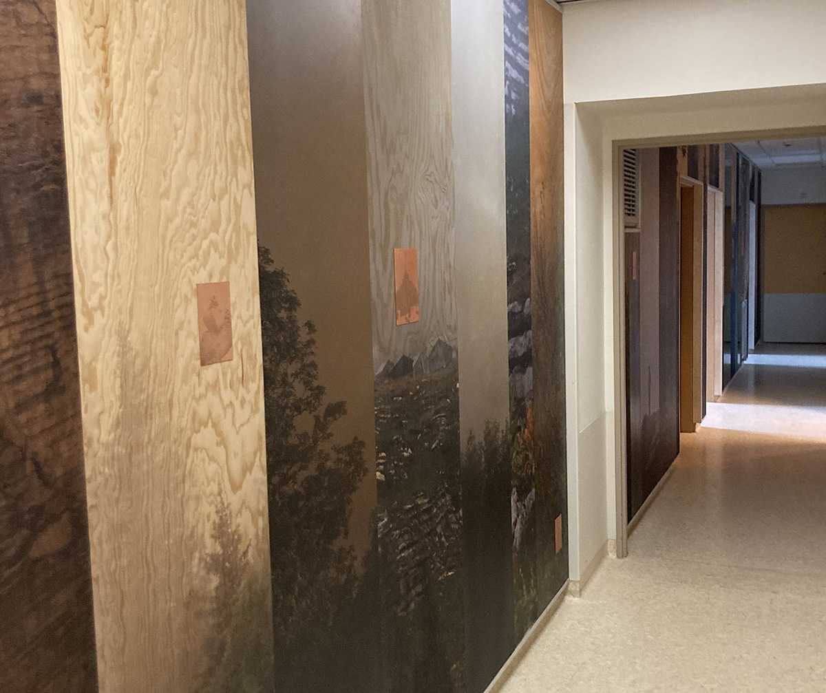 Cette œuvre pérenne travaille sur la question de la réappropriation de son lieu de soins, proposant une analogie entre parcours de soins et parcours en espace naturel, avec l’idée de créer un imaginaire autour des montagnes alpines, permettant aux patients de s’évader l’espace d’un instant.