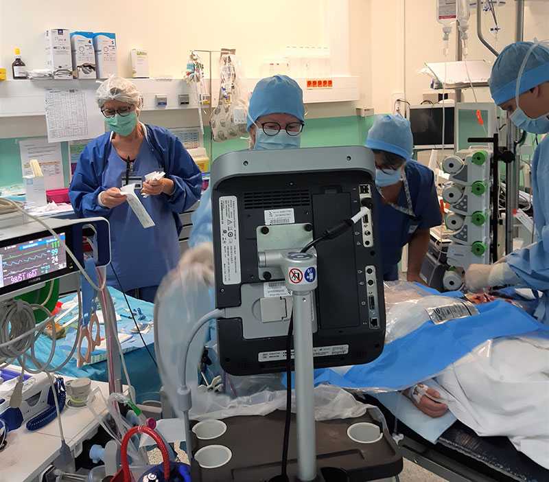 Tôt le matin, au premier étage de l’HFME, dans le bloc opératoire où va se dérouler la greffe, le décor se met en place. Au centre de la pièce, Margaux déjà endormie, est soigneusement préparée pour le grand jour. « Avec ce type d’opération qui demande beaucoup d’efforts au cœur, c’est davantage de la réa peropératoire que de l’anesthésie », indique la Dr Catherine Boucaud-Le Brun, anesthésiste-réanimateur qui sera épaulée par un confère venu se former aux techniques spécifiques de la greffe hépatique. Dans l’espace réduit du bloc, les infirmières de blocs (Ibode) qui installent le matériel sur un champ stérile – plus de 50 instruments, écarteurs et autres dispositifs - et les infirmières anesthésistes (Iade) qui « techniquent » l’enfant, se croisent et se recroisent, veillant à ce que tout soit prêt pour cet acte chirurgical lourd et complexe.