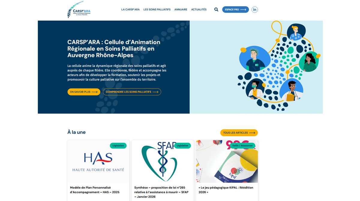 Créée en mars 2024 sous l'égide du Groupement de coopération sanitaire HOURAA (GCS HOURAA) et financée par l'ARS Auvergne-Rhône-Alpes, la Cellule d’Animation Régionale en Soins Palliatifs Auvergne-Rhône-Alpes (CARSP’ARA) a pour vocation de fédérer les acteurs sanitaires et médico-sociaux. Son objectif : rendre la démarche palliative plus lisible et accessible sur l'ensemble du territoire régional.