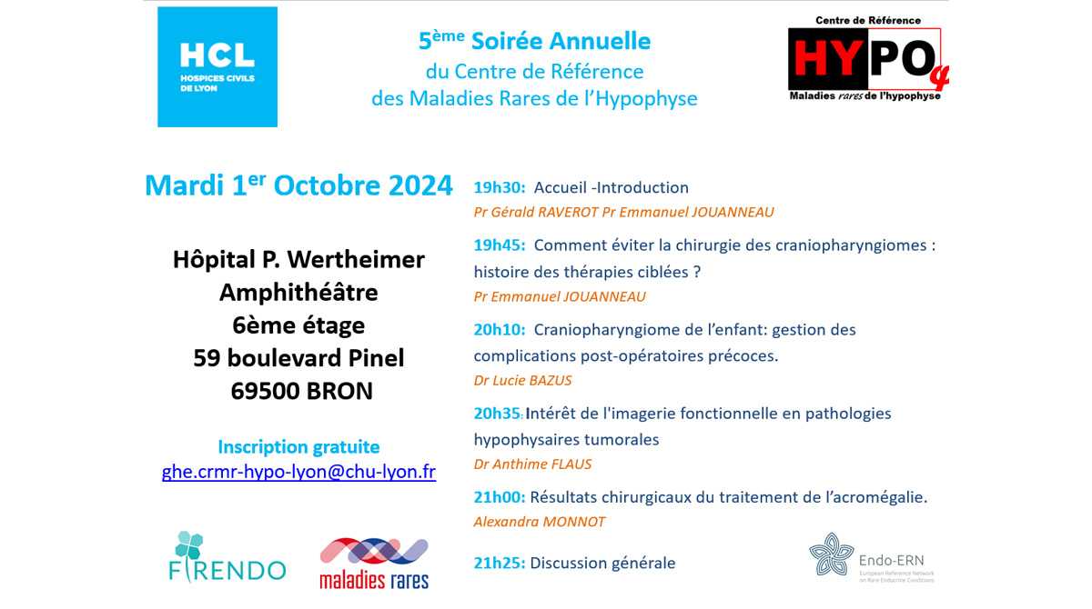 Cette soirée sera l'occasion de faire le focus sur la prise en charge des craniopharyngiomes de l'adulte et de l'enfant, d'évaluer l'intérêt du traitement chirurgical de l'acromégalie et de discuter des perspectives en terme d'imagerie fonctionnelle hypophysaire.