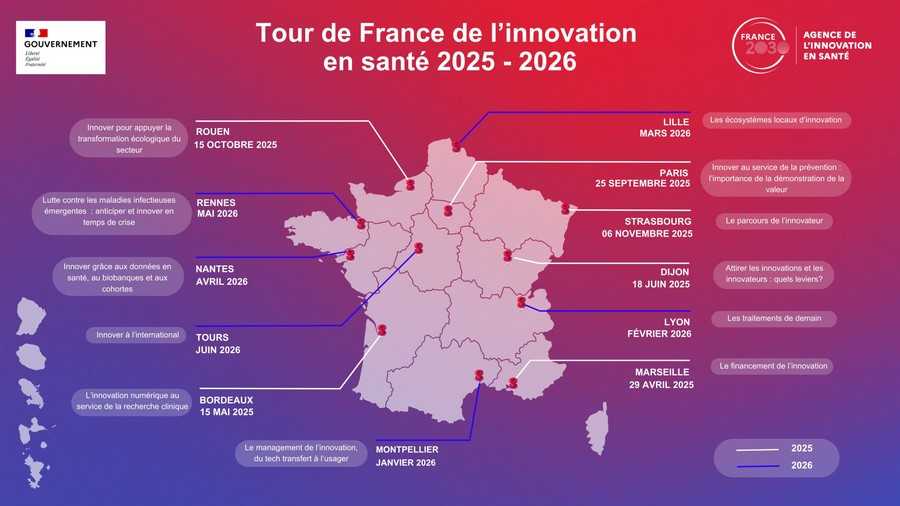 Dans le cadre du plan d’investissement France 2030, l’Agence de l’innovation en santé (AIS) propose la deuxième édition de son Tour de France. Ce rendez-vous itinérant sillonne les douze régions métropolitaines pour aller à la rencontre des acteurs de l’innovation en santé. À chaque étape, un colloque national décentralisé permet d’échanger autour des grands enjeux du secteur, de partager des retours d’expérience concrets et de construire des solutions adaptées aux besoins du terrain. Ces rencontres sont aussi l’occasion de valoriser les réussites locales qui contribuent, chaque jour, à améliorer la vie des patients et le quotidien des professionnels de santé.